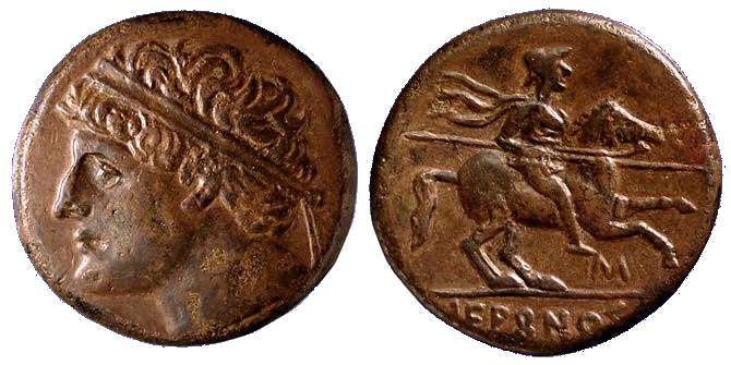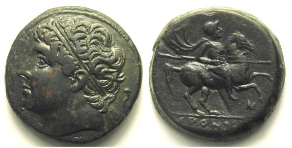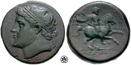 | SNG ANS 935 | Syracuse, Sicily, Hieron II AE 28mm. 274-216 BC. Diademed head left / Horseman galloping right, with couched lance, M below horse, IEΡΩNOΣ in ex. | Text | Image |