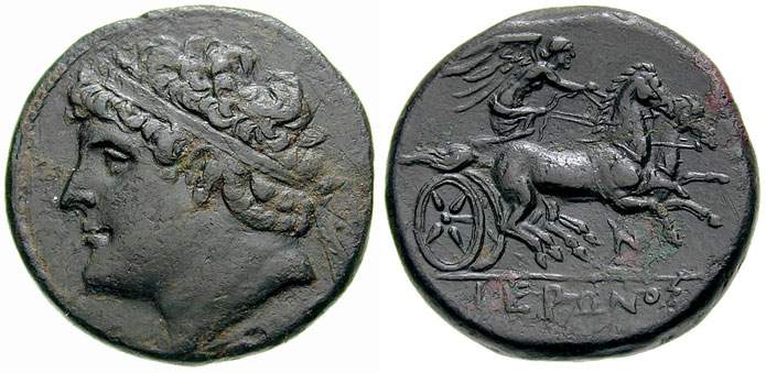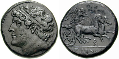 | Calciati 196 | Syracuse, Sicily. Hieron II. 275-215 BC. AE 34mm. Diademed head of Hieron II left / IEΡΩNOΣ beneath Nike driving galloping biga right; N below. | Text | Image |