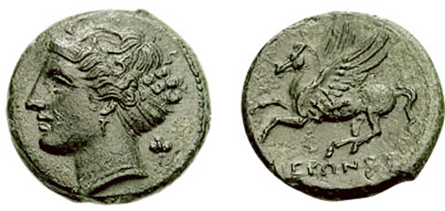 | Calciati 202 | Syracuse, Sicily. Hieron II. 275-215 BC. AE 16mm. Head of Persephone left, hair bound in ampyx and sphendone; poppy head behind / IEΡΩNOΣ, Pegasos flying left. SNG ANS 1018. | Text | Image | Text | Image |