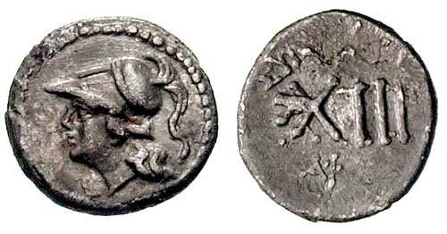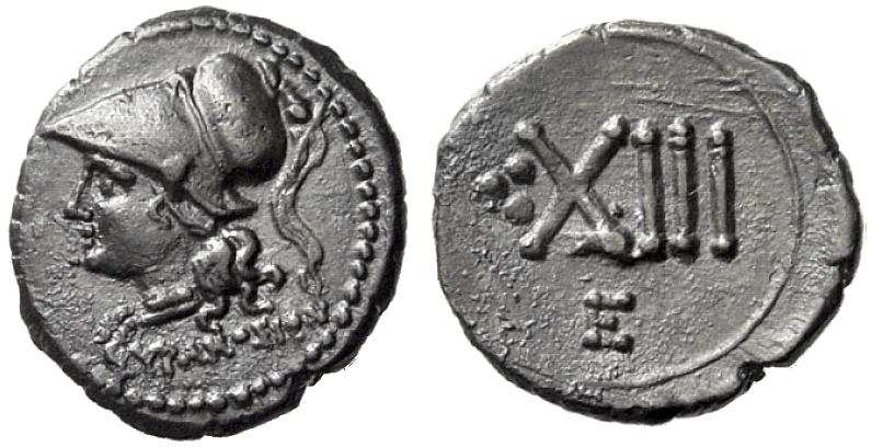 | Caltabiano 317 | Syracuse, Sicily, under Hieron II, 275-215 BC. AR litra. 12mm, 0.77 g. Struck ca. 216-215 BC. ΣYΡAKOΣION beneath head of Athena left, wearing Corinthian helmet. XIII with three dots to left, E below. Caltabiano 317; Hoover HGC 1426 var. (= legend on reverse). | Text | Image |