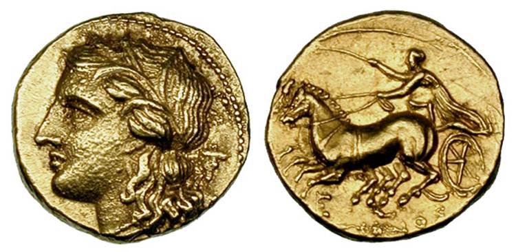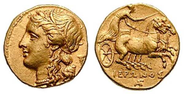 | SNG ANS 865 | Syracuse, Sicily. Hieron II (274-216 BC). AV drachm, 4.27 g. Head of Kore left, wreathed with corn, in pearl necklace, bucranium behind / IEΡ-ΩNOΣ, charioteer driving fast biga left, E beneath horses. SNG ANS 865-866. SNG Cop 818. | Text | Image |