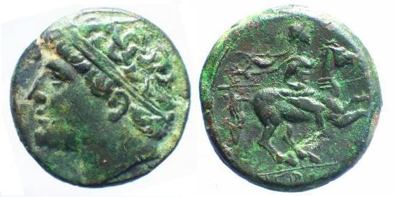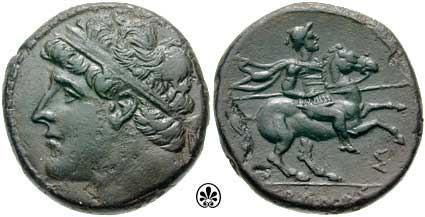 | SNG ANS 919 | Syracuse, Sicily. Hieron II. c274-216 BC. AE 27mm. Laureate head of Hieron left; herm behind / mounted horseman galloping right, holding long spear pointed forwards; I below. SNG ANS 919. | Text | Image |