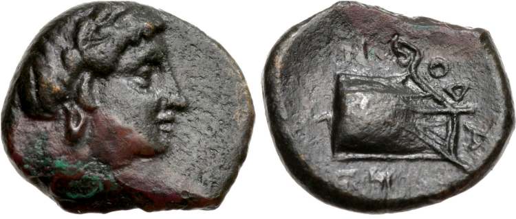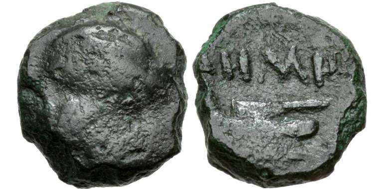 | BCD 63 (1) | Demetrias, Thessaly. AE13, ca 290 BC. 1.44 g. Wreathed female head right, wearing pendant earring and with the hair pulled up. / Δ-HMHTΡI-A-ΔO-Σ anticlockwise from centre left, elaborate prow right, its top curling backwards. BCD 63-1; Rogers 206 corr. (all comparative refs are incorrect). | Text | Image |