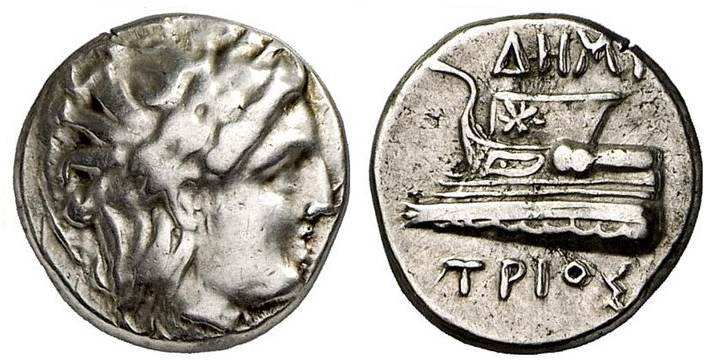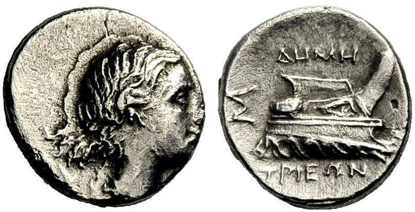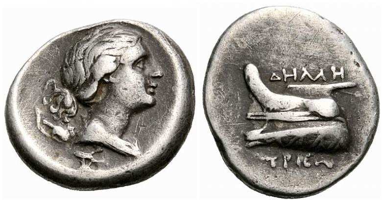 | BMC 1 Sear SG 2077 | Demetrias, Thessaly, AR hemidrachm. Ca 290 BC. Head of Artemis right, quiver over shoulder / ΔHMH-TΡIEΩN above and beneath prow right, IΣ monogram in left field. BMC 1; SNG Cop 48-49. | Text | Image |