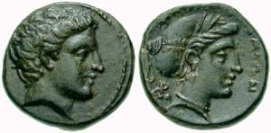 | BMC 4 | Phalanna, Thessaly. 300-190 BC. Young male head right / ΦAΛANNAIΩN, Head of Nymph Phalanna right, hair in sakkos. | Text | Image |