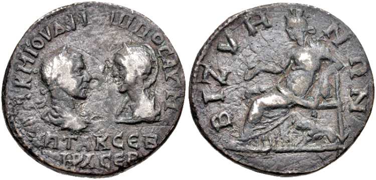 | Varbanov 1581 | Philip I and Otacilia Severa, AE29 of Bizya, Thrace. AD 244-249. 11.9 g. AYT K M IOYΛ ΦIΛIΠΠOC AYΓ M ΩTAK CEBHΡA CEB, laureate, draped and cuirassed bust of Philip right, facing diademed and draped bust of Otacilia left. / BIZYHNΩN, Kybele seated left, holding patera and resting arm on tympanum, lion left at her side. Varbanov 1581 var (obv legend); Paris 306; Sofia 7609; Jurukova 140. | Text | Image |