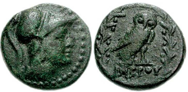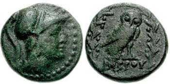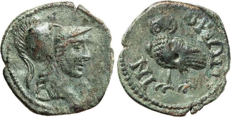 | BMC 6-7 | Imbros, Thrace. AE16, 2nd c. AD. 4.21 g. Helmeted head of Athena right. / IMBΡIΩN, owl standing left, head facing. BMC 6-7; SNG Cop. 365. | Text | Image |