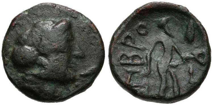 | Imhoof Imbros 1 | Imbros, Thrace. AE12, civic issue. ca 350-300 BC. 2.55 g. Head of Artemis or Persephone right. / IMBΡOY, ithyphallic Hermes standing right before an altar, holding patera and branch. Caduceus in upper right field. Imhoof Imbros 1; SNG Cop. 953; Imhoof Choix I, 10. | Text | Image |