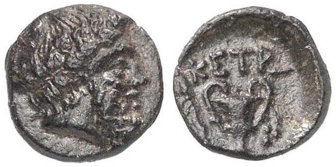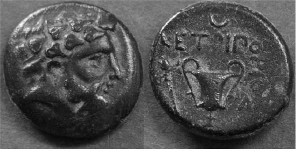 | Topalov 108 | Ketriporis, King of Thrace, AE unit, 356-352 BC. Bearded head of Dionysos right, wreathed with ivy / KETΡIΠOΡIOΣ, kantharos, crescent above, thyrsos to left. Topalov ("Urban..), 108; Mionnet II, 9. | Text | Image |