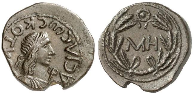 | SNGCop 32v | Kingdom of Thrace. Kotys II., 124-133 AD. 48 Nummia. 10.89 g. BACILEWC KOTYOC, Bust of Kotys right, holding trident / MH, Value within wreath. SNG Cop. 32 var. | Text | Image |