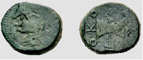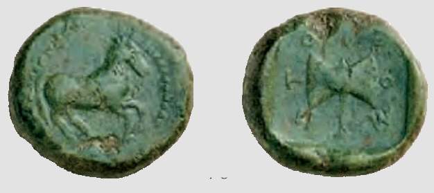 | Helios 5, 33 | Thracian-Scythian dynasties, Metokos, ca. 407-389 BC. AE, 14.10 g. Horse rearing left, dotted border / MHTOKO, double axe (bipennis). Helios auction 5, lot 33. | Text | Image |