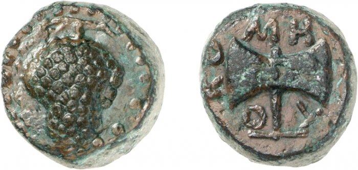 | Topalov 83 (2) | Metokos, King of Thrace. AE unit, ca 405-391 BC. 15.34 g. Bunch of grapes / MHTOKO, double-axe (bipennis). Topalov 83. | Text | Image |