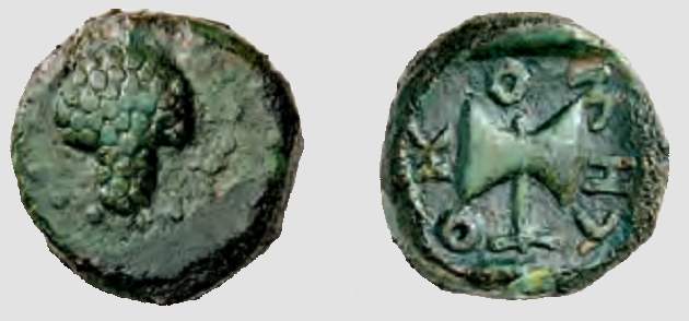 | Topalov 83 | Thracian-Scythian dynasties, Metokos, ca. 407-389 BC. AE, 12.59 g. Bunch of grapes within dotted border / MHTOKO, double axe (bipennis). Topalov 83. | Text | Image |