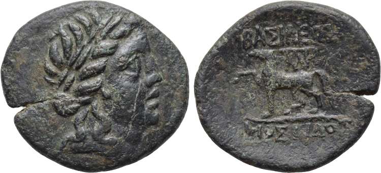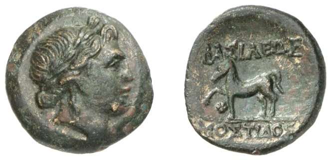 | Paunov 2B | Mostis, King of Thrace, ca 140-100 BC. AE21, 4.48 g. Laureate head of Apollo right / BAΣIΛEΩΣ MOΣTIΔOΣ above and beneath horse trotting left, right foreleg raised, no monogram, small rosebud or rosette in left field. Paunov, Type 2B (this coin illustrated); Helios 7, 224. | Text | Image |