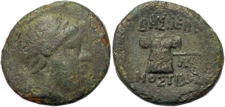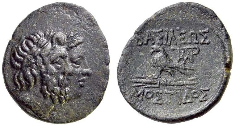 | Moushmov 5768 | Mostis, King of Thrace, ca 140-100 BC. AE19, 4.12 g. Helmeted head of Mostis right / BAΣIΛEΩΣ MOΣTIΔOΣ above and beneath cuirass, ΠAΡ monogram in right field. SNG Cop 1173; Jurukova 141; Moushmov 5768. | Text | Image |