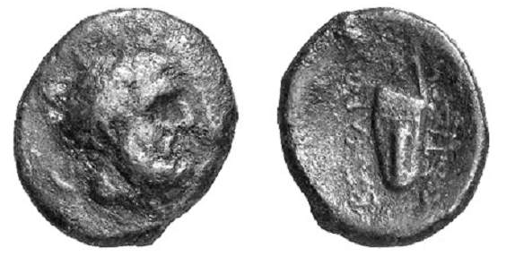| Jurukova 142 | Mostis, King of Thrace, ca 140-100 BC. AE16, 2.95 g. Bearded head of Herakles right / BAΣIΛEΩΣ MOΣTIΔOΣ to right and left of bow in bowcase. Moushmov (1927), 172; Jurukova 142; Topalov 139-140. | Text | Image |
