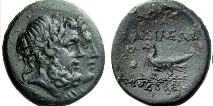 | SNG Black Sea 311 | Mostis, King of Thrace, ca 140-100 BC. AE21, 3.58 g. Jugate heads of Zeus and Hera right / BAΣIΛEΩΣ MOΣTIΔOΣ, eagle standing left on thunderbolt, (no monogram in right field). SNG Black Sea 311. | Text | Image |