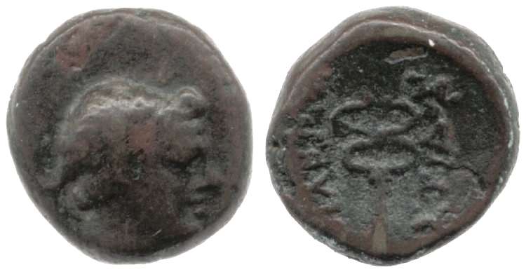 | Paunov 4 | Mostis, King of Thrace, AE17, ca 126-86 BC. 2.94 g. Laureate head of Zeus or Herakles right / BAΣIΛEΩΣ MOΣTIΔOΣ, bow in bow case. Paunov 4; Moushmov (Rois Thraces) 172; Jurukova 142; Berlin 18214369. | Text | Image |