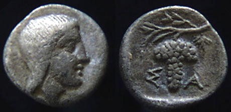 | Moushmov 5692 | Thracian Kingdom, Saratogos AR Obol. Long-haired male head right (Saratogos?) / Σ-A, bunch of grapes on a vine. | Text | Image | Text | Image |