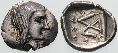 | Moushmov 5694 | Thracian Kingdom, Saratokos. Late 5th Century BC. AR Trihemiobol. Youthful male head right / large monogram MΔ, ΣAΡATOKO around; all within incuse square. Jurukova 31. | Text | Image | Text | Image |