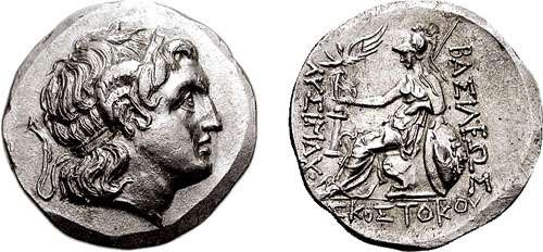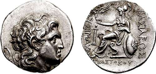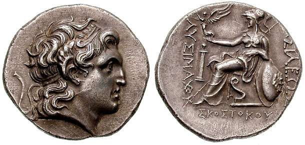 | SNGCop 1171 | Kingdom of Thrace, Skostokos AR Tetradrachm. Circa 277-260 BC. Ainos mint. Diademed head of the deified Alexander right, with horn of Ammon / BAΣIΛEΩΣ ΛYΣIMACOY ΣKOΣTOKOY, Athena seated left, holding Nike in extended right hand, left arm resting on shield, spear behind; herm at inner left, ΣKOΣTOKOY below. SNG Ashmolean 3779, Youroukova 103. | Text | Image | Text | Image | Text | Image | Text | Image | Text | Image |