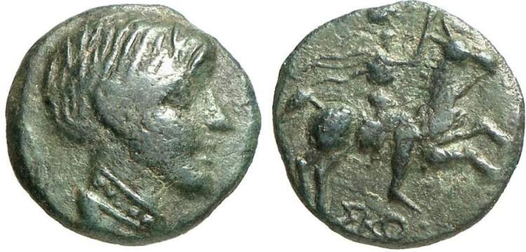 | SNG Stancomb 300 | Skostokos, king of Thrace, AE18. ca 277-260 BC. 2.80 g. Kabyle mint. Draped, youthful male bust right, with short hair and pearl neck band / ΣKOΣ[TOKOY], rider on horseback galloping right, raising right hand. SNG Stancomb 300. | Text | Image |