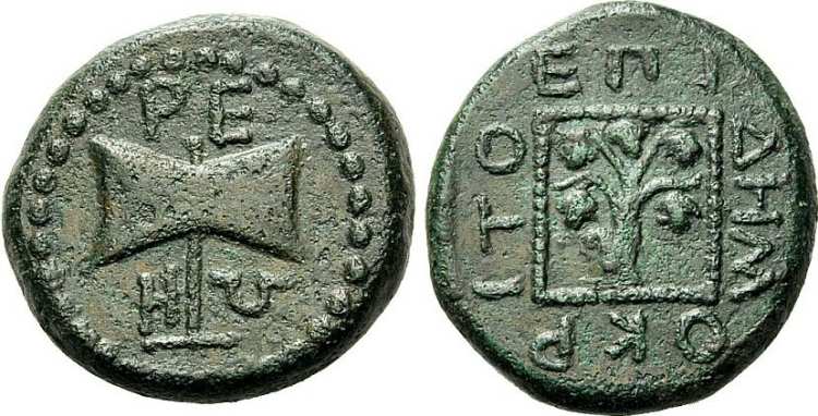 | Topalov 47 | Teres II or III, King of the Odrysians, Thrace. AE. Ca 350-347 BC. Magistrate Demokritos. T H Ρ E Ω around bipennis (double axe), the T formed by the handle. / EΠI ΔHM-OKΡ-ITO around grapevine with six bunches of grapes within linear square. Topalov Odrysians 47. | Text | Image |