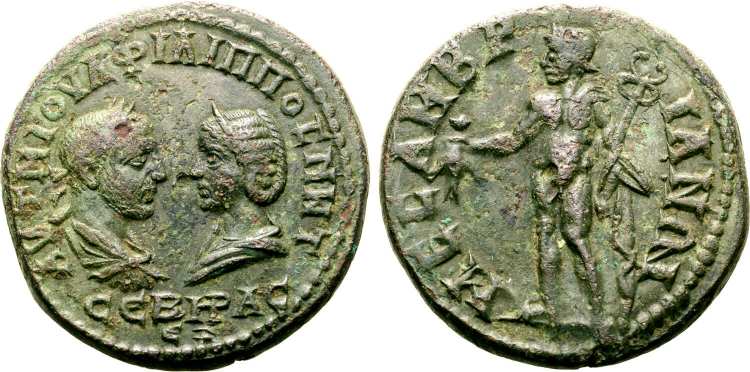 | Moushmov 4019 | Philip I and Otacilia Severa AE29 of Mesembria, Thrace. AVT M IOVΛ ΦIΛIΠΠOC M ΩT CEVHPA CEB, laureate, draped bust of Philip I right, facing draped bust of Otacilia Severa left / MECAMBΡIANΩN, Aequitas-Dikaiosyne standing left with scales and cornucopiae. | Text | Image |