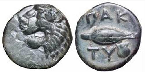 | RN 2012, 256 | Paktye, Thrace (Thracian Chersonesos), AE11, civic issue. Ca 375-325 BC. 0.91 g. Head of roaring lion left. / ΠAK-TY above and beneath barley corn, scallop shell at lower right. Arslan, Tyra 1197; Tyra museum inv. Et9; CN 2704. | Text | Image |