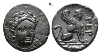 | Sear 4099 | Gergis, Troas, AE17, 400-241 BC. 3.6 g. Three-quarter facing head of Sibyl Herophile, turned slightly right, wearing laurel wreath and pendant necklace./ ΓEΡ, Sphinx sitting right, grain ear below. BMC 5-8; SNG Tuebingen 2594 and 2596-2597; Luynes 2515; SNG von Aulock 1514; SNG Cop 339. |