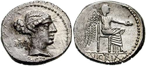 | RSC 10 | M Cato Denarius. 47-46 BC. Draped female bust right / Victory seated right, holding patera. Cr462/1a. | Text | Image | |