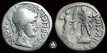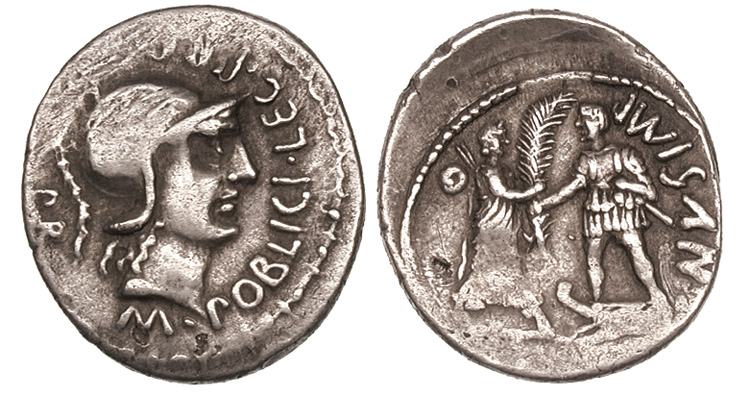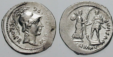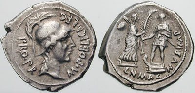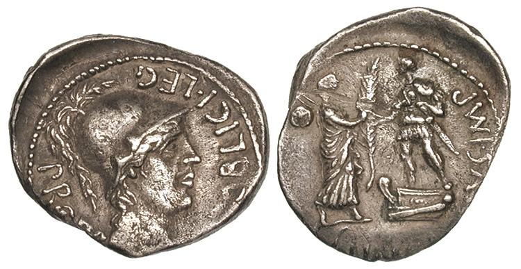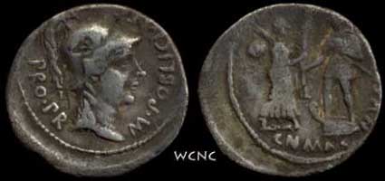 | Pompeia 9 sear5 #1384 | Pompey the Great 46-45 B.C. AR Denarius. Head of Roma r., in Corinthian helmet; before, M POBLICI LEG PRO, behind, P R / CN MAGNVS IMP, female figure standing right with shield & spears, handing palm to soldier on prow. Syd 1035. Cr469/1a. | (11 examples) | ||