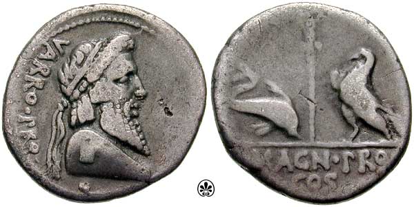 | RSC 3 | Cn Pompey Junior, 49 BC. AR Denarius. VARRO PRO Q, diademed bust of Jupiter right / Dolphin, scepter and eagle, MAGN PRO/COS in exergue. Cr447/1a, Syd 1033; RSC 3. | Text | Image | |