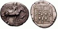 | 6362 | The same obverse; in the margin raven alighted on branch. Rev. : MENΔAION. Five bunches of grapes within incuse square. 26 mm. Plate XLIV 1. | |||