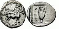 | 6360 | Silenos seated on donkey, advancing right. Rev. : MENΔAIH (sic). Cup with two handles within incuse square. 15 mm. Plate XLIV 5. | |||
