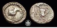 | Macedon, Mende. Circa 460-423 BC. AR Tetartemorion (0.35 gm). Forepart of an ass right / Kantharos within incuse square. SNG ANS 365, SNGCop 206.. | ![]() | |||