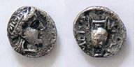 | 6374 | Bakhantka’s head with ivy wreath left. Rev. : MENΔAIΩN. Vase with two hadles. 12 mm. Plate XLIV 2. | |||