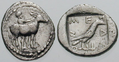 | 6368 | Silenos leading donkey right. Rev. : MENΔAIΩN. Raven or eagle standing right. All in incuse square. 14 mm. Plate XLIV 4. | |||