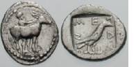 | 6377 | The same obverse. Raven pecking under the tail of the donkey. In the margin vine. Rev. : Five incuse triangle s . 23 mm. Plate XLIX 13. | |||
