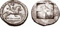 | Macedona, Sermylia AR Tetradrachm. Circa 500-480 BC. Σ(retrograde)EΡMVΛIAON, warrior on horseback right, brandishing spear in right hand, pellet behind / Shallow quadripartite incuse square. AMNG III 2 = Traité pl. LIII, 2 | ![]() | |||