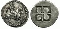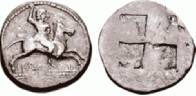 | 6472 | ΣEPMYΛIKON. Horseman bearded, naked, galloping right, hurling spear with right hand, and with left hand holding the bridles of the horse; beneath the horse – hound running right. Rev. : Quadripartite incuse square. 27 mm. Plate L 10. | |||