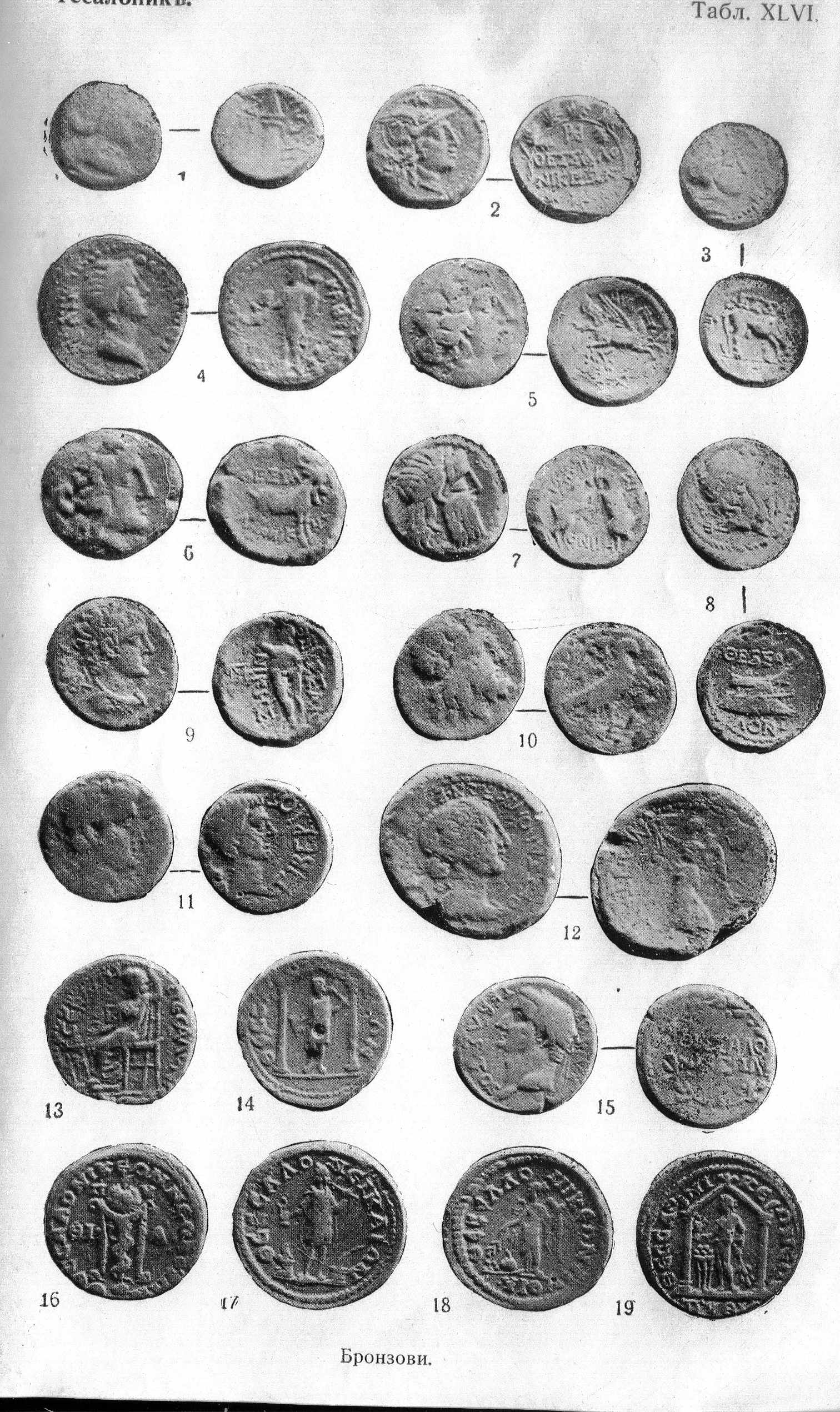 | 6658 | ΘEOC. His head right. Sometimes N in countermark. Rev. : ΘΕΣΣΑΛΟΝΙΚEΩΝ. Augustus’ head right. Plate XLV 17. | |||