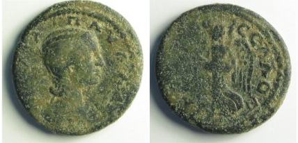 | 6662 | AΓΩNOΘEΣIA. Woman’s head right. Rev. : ANT KAI within laurel wreath. | |||