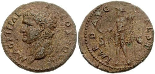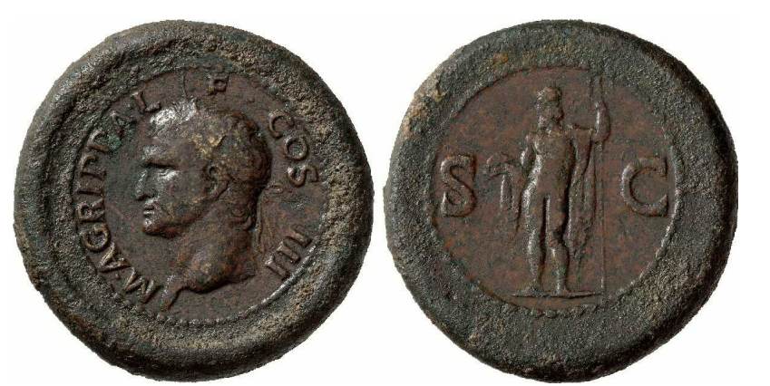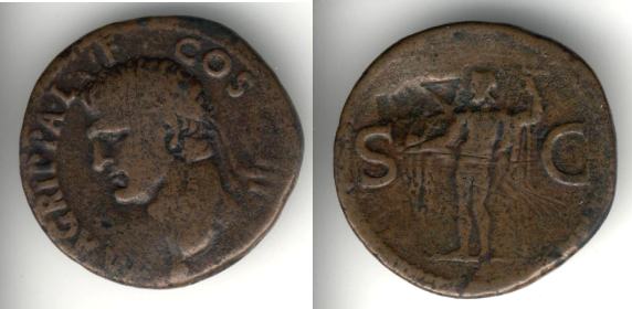 | RIC 58 Sear5 #1812 | Agrippa, AE As. Agrippa. Struck under Caligula, 37-41 AD. M AGRIPPA L F COS III, head left wearing rostral crown / S-C, Neptune standing facing, head left, naked except for cloak draped behind him & over both arms, holding small dolphin in right hand & vertical trident in left. Cohen 3. | Text | Image |