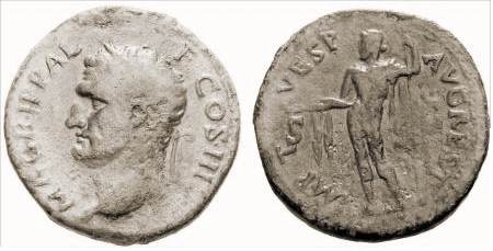 | RIC 457[domitian] Sear5 2894 | Agrippa AE As. Rome mint, restitution issue struck under Domitian, ca 82 AD. M AGRIPPA L F COS III, head left, wearing rostral crown / IMP D AVG REST S-C. Neptune standing left, holding small dolphin & trident. RIC 457 (Domitian); BMCRE 510 (Domitian); Cohen 7. | Text | Image |
