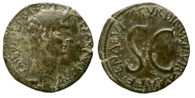| RIC 160 Sear 1731 | Agrippa and Augustus AE As. Gaul, Nemausus, circa 10-14 AD. IMP DIVI F P-P, back-to-back heads of Agrippa, in combined rostral crown and laurel wreath, and Augustus, aureate / COL-NEM, long, vertical palm with crocodile chained below, wreath to left of palm tip with ties trailing to right. RPC 525. | Text | Image |