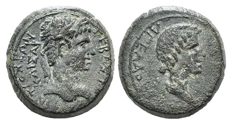 | Mopsus RPC 4049 | Divus Augustus and Diva Livia AE26 of Mopsus, Cilicia, struck by Tiberius. ΘEOC CEBACTOC MOΨEATΩN ..], radiate head of Augustus left / [Θ C]EBAC[TH MOΨEATΩN, draped bust of Livia right, hair in a bun (behind head). RPC 4049. | Text | Image |