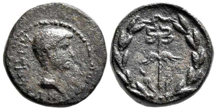 | Antioch Syria RPC 4250 | Augustus, AE28 of Antioch, Syria. Year 27, ca. 5-4 BC, 19.21 gr. Laureate head right / AΡXIEΡATIKON ANTIOXEIΣ ZK in four lines within wreath of an archiereus. RPC 4250; BMC 167. | Text | Image |
