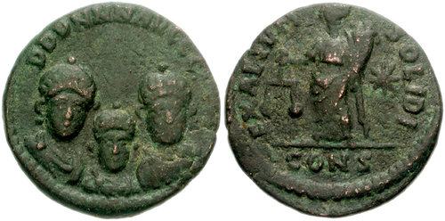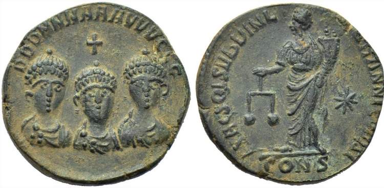 | Constantinople Ackermann 4 | Honorius, Theodosius I, and Arcadius. Ca AD 402-408. AE Exagium (20mm, 4.00 g). DDD NNN AVGGG, diademed and draped facing busts of Honorius, Theodosius and Arcadius / EXAGIVM SOLIDI, Moneta standing left, holding scales and cornucopiae; star in right field. Mintmark CONS. Cf. Göbl, Antike 228-229; RIC X, p. 8. Ackermann 4. | Text | ![]() |