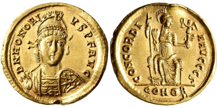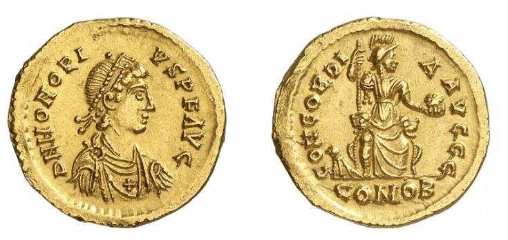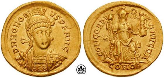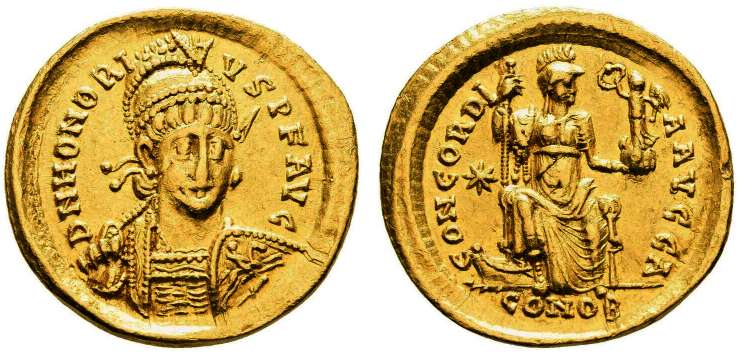 | Constantinople RIC X 30 | Honorius AV Solidus. DN HONORIVS PF AVG, pearl-diademed, helmeted and cuirassed three-quarter facing bust, spear over shoulder and shield decorated with horseman spearing a fallen enemy / CONCORDIA AVGG and officina letter, Constantinopolis seated facing with sceptre and Victory on globe, prow to left, star in left field. Mintmark CONOB. Sear 20902. | Text | ![]() |